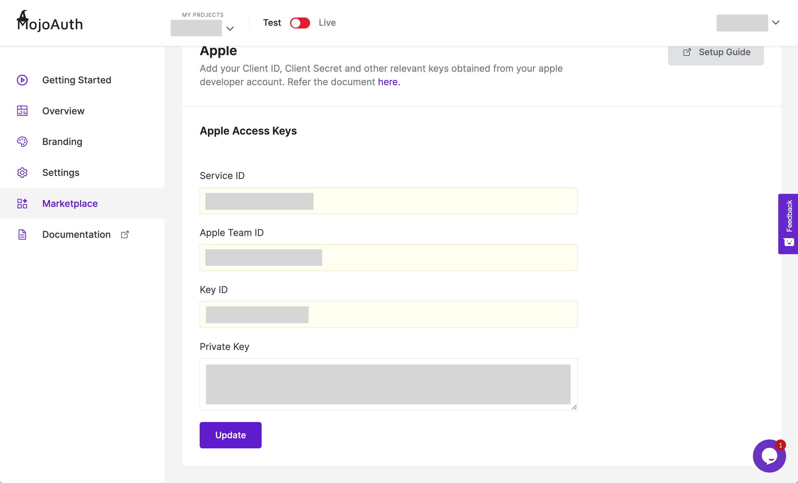 Your Apple social login is now configured. You can see the configured social logins under configured Integrations on the marketplace page.